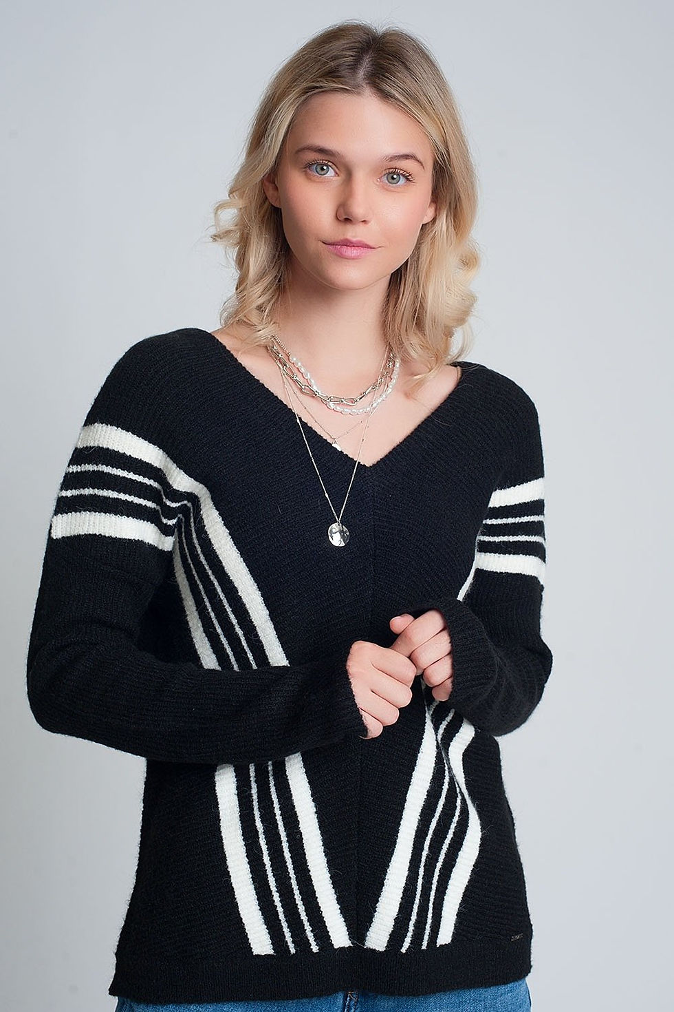 V Neck Sweater With Contrast Stripe in Black