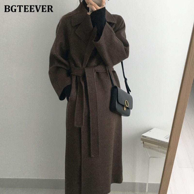 Chic Elegant Notched Collar Women Blend Coats Winter Warm Loose Lace-Up Long