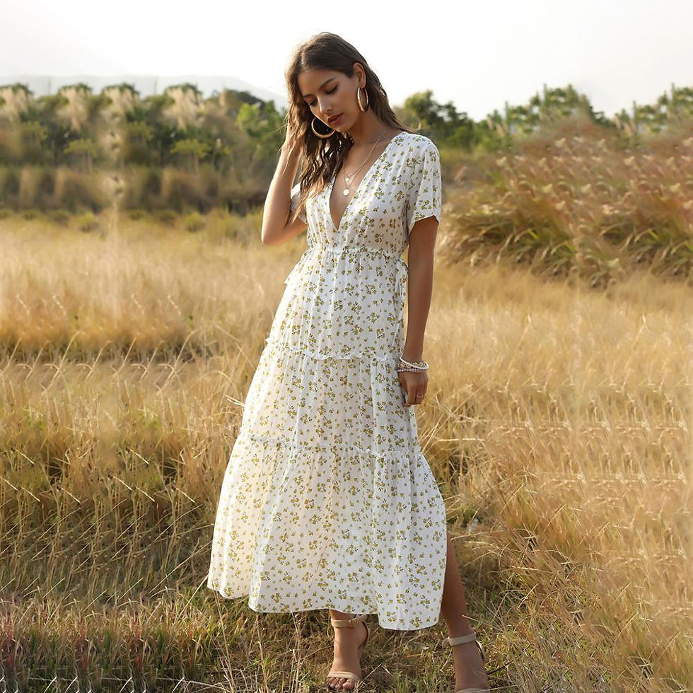 White Long Dress Women Elegant Floral Ruffle Sexy Deep v Neck Slit Dresses