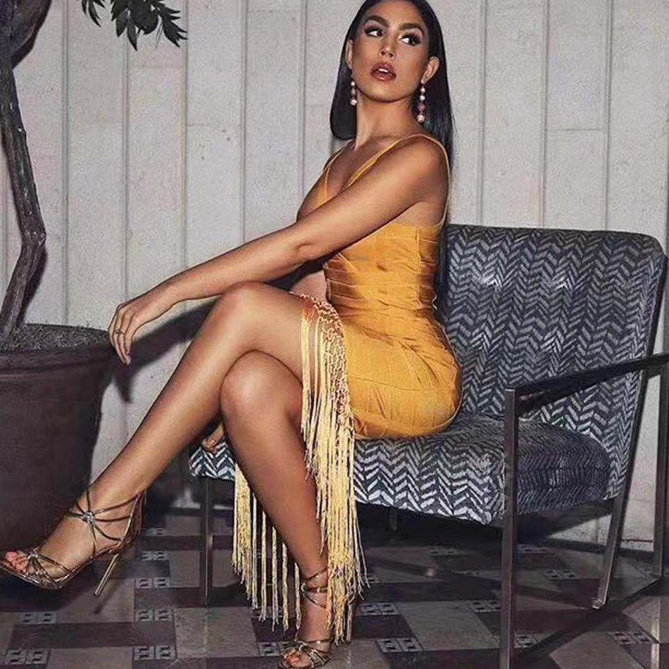 Ginger Yellow Tassel Bandage Dress Sleeveless Bodycon Club Midi