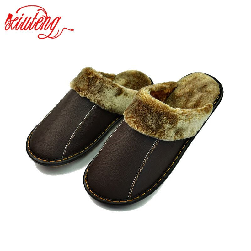 Cow Leather Men Slippers Warm Plush Non Slip Waterproof Slippers Comfortable