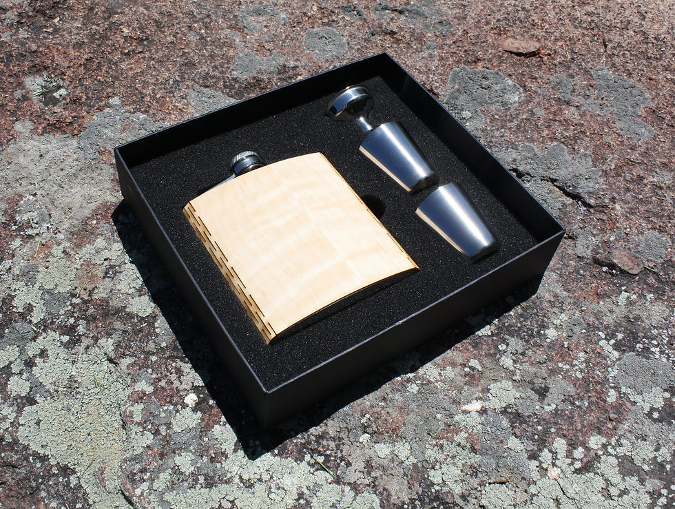 Real Wooden 6 Oz. Hip Flask in Premium Gift Box With Shot Glasses & Funnel