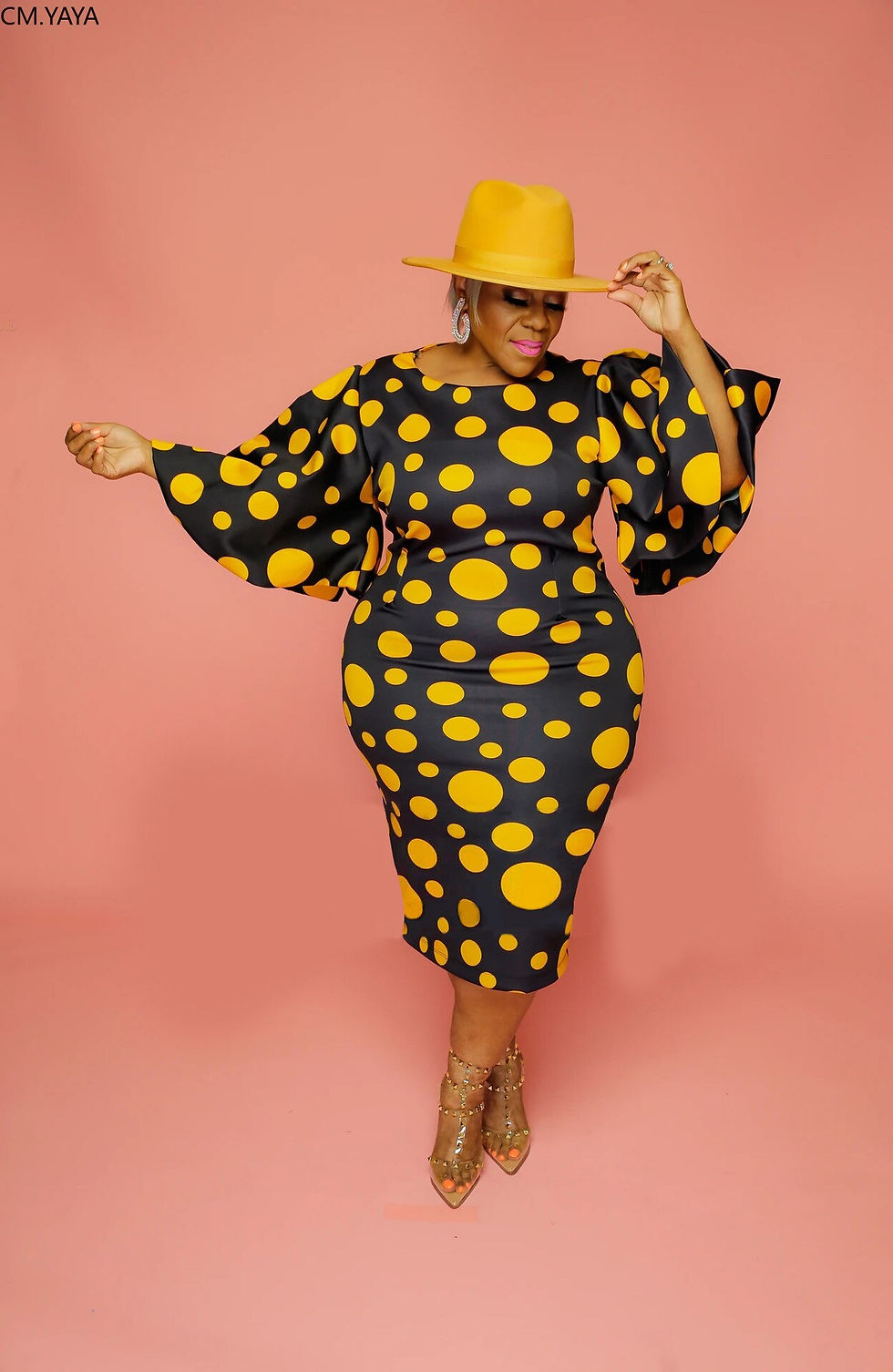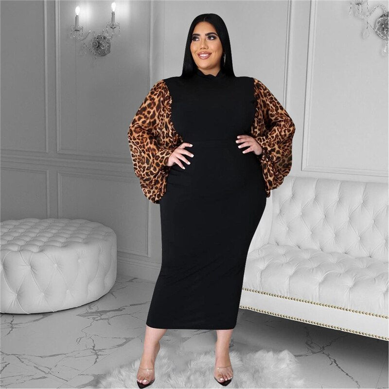 Plus Size XL-4XL Elegant Leopard Lantern Long Sleeve Super Stretch Bodycon