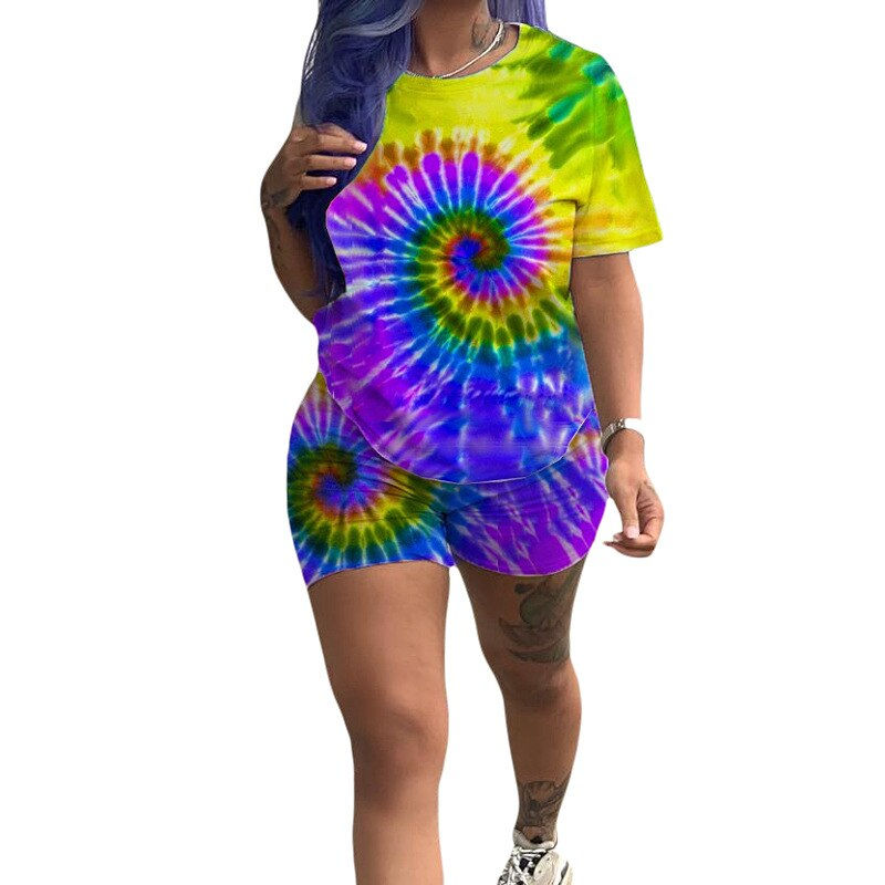 Print Two Piece Set Women Summer Lounge Wear O-Neck T-Shirts and Shorts Outfits