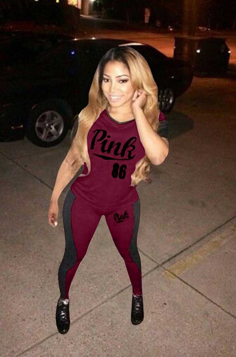 PINK Letter Print Two Piece Set Tracksuits Women Summer Fitness Lounge